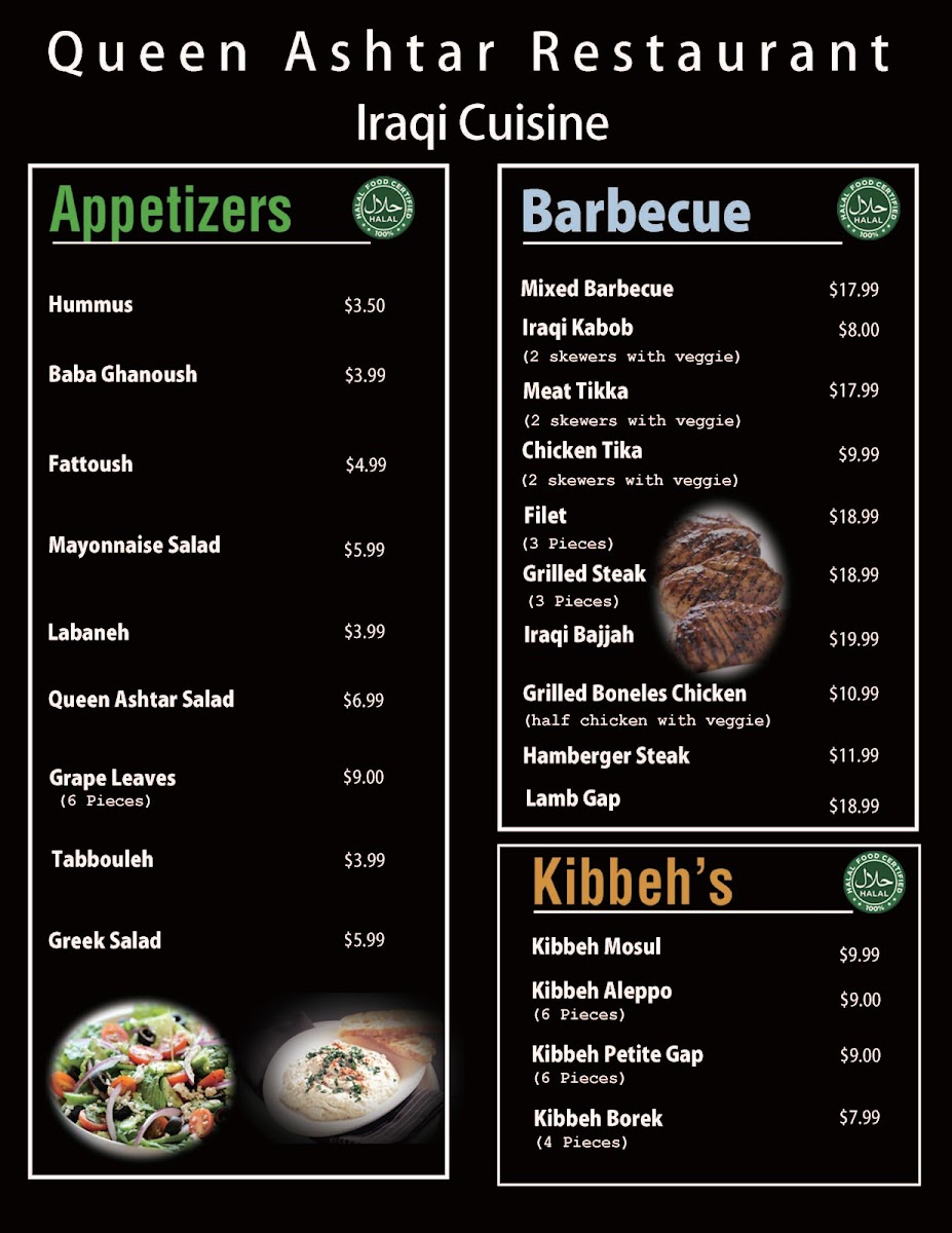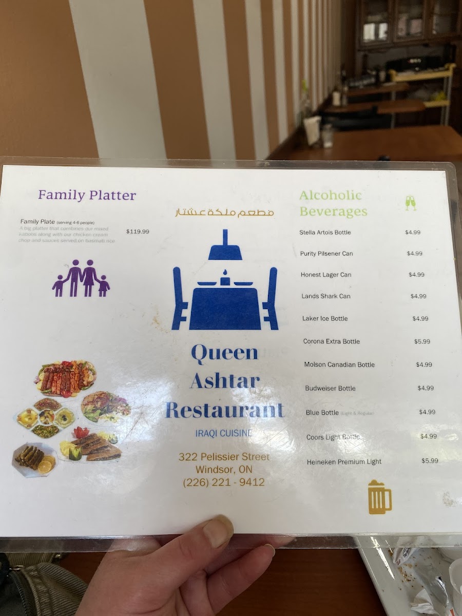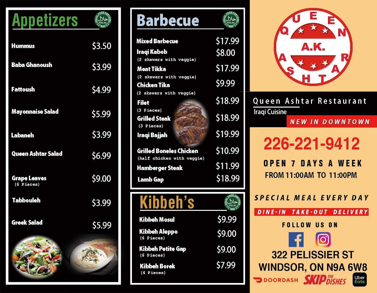 Welcome to Queen Ashtar Restaurant, where each dish is a delightful journey through unique culinary traditions! Nestled at 322 Pelissier St, Windsor, ON, our menu showcases a variety of mouthwatering specialties that are sure to tantalize your taste buds. From sumptuous appetizers to hearty entrees and decadent desserts, we invite you to explore an array of flavors that celebrate the richness of our heritage. Don’t miss our signature dishes that highlight fresh ingredients and authentic recipes—ideal for both adventurous eaters and those seeking familiar comforts. Join us and let Queen Ashtar Restaurant become your new favorite dining destination!